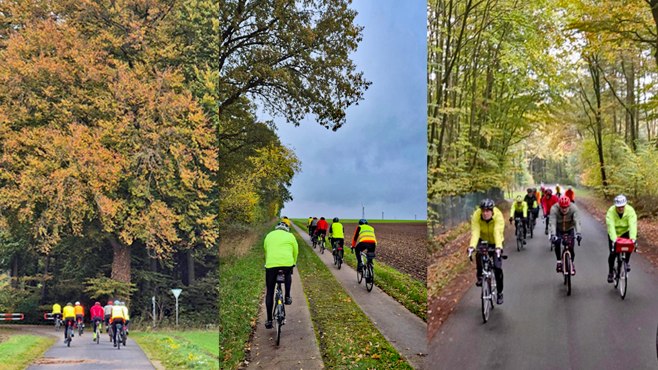 Nach der Pause ist wie immer Fotoshooting angesagt, dieses Mal von oben herab. Schöne Variante. Dann fahren wir erst einmal ein Stück den gleichen Weg zurück bis Dünsen. Hier biegen wir rechts ab und radeln parallel zum Dünsener Bach bis zur Landesstraße nach Stühren. Diese Strecke ist landschaftlich sehr schön und auch die Landesstraße ist erfreulich leer, so dass wir ohne Stress und Zwischenfälle nach Stühren kommen.