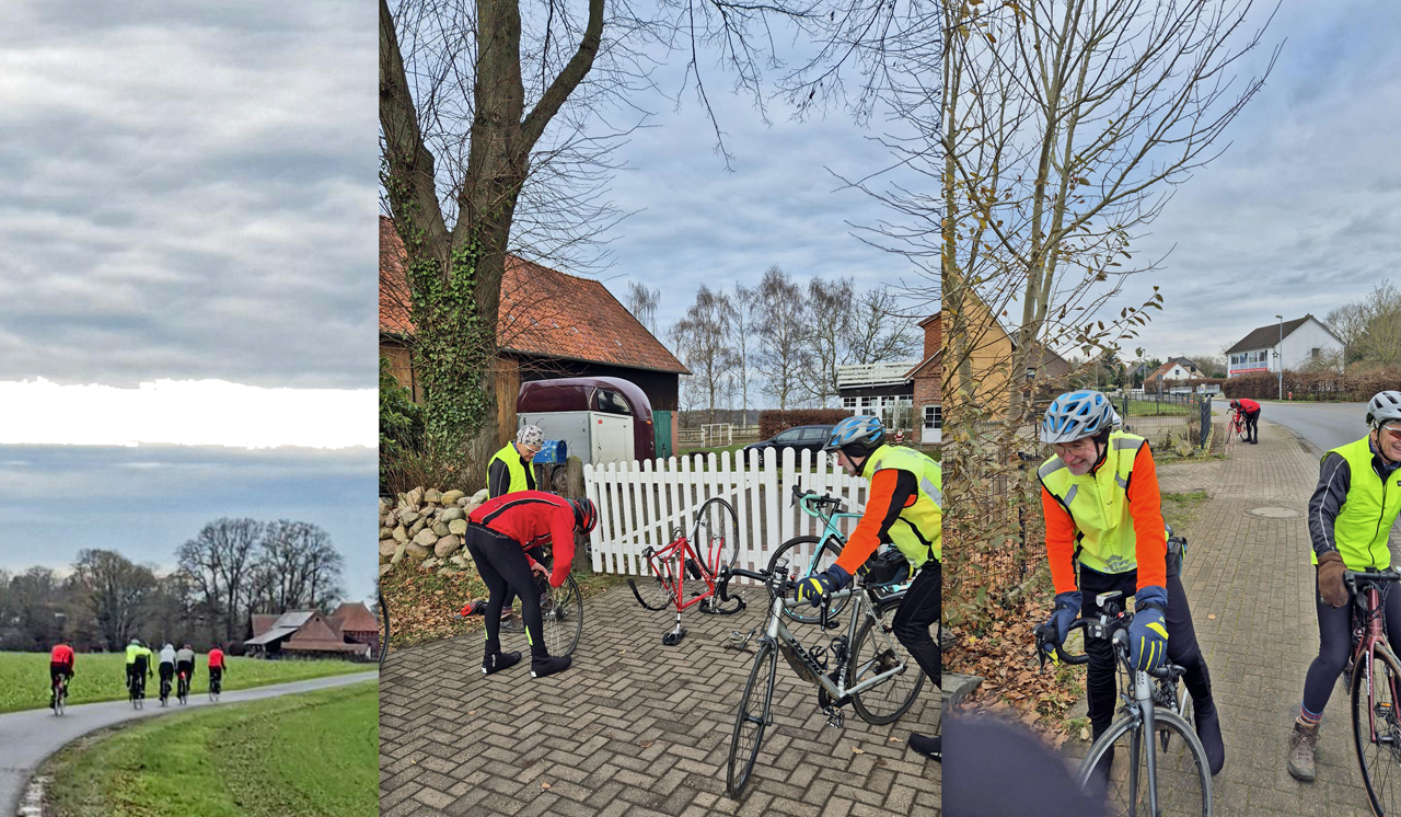 Weiter geht's, oder? Halt, die Handschuhe sind liegen geblieben. Weiter geht's. Doch halt, die Kette ist wieder abgesprungen. Kleine Pause, weiter geht's. Ein Teil ist schon voraus gefahren. So kommen wir schließlich glücklich zu fünft doch noch in Syke an.